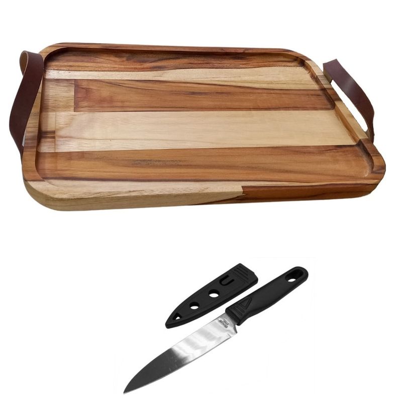 Bandeja de madeira feita a mão com alças em couro com uma faca utility