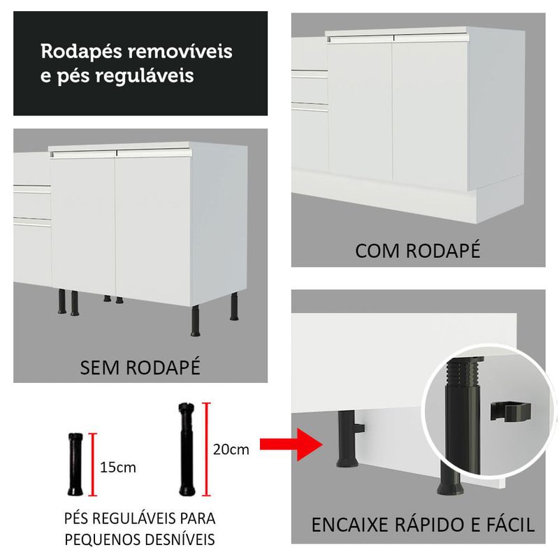 Para completar, possui pés reguláveis em PVC e rodapé removível em MDP com encaixe fácil, para facilitar na hora da limpeza.