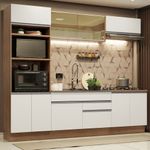 O acabamento da estrutura é em amadeirado Rustic e o das portas e frentes é branco. É feito em Pintura Poliéster com 7 camadas que protegem o móvel dos efeitos do álcool da água e do calor.