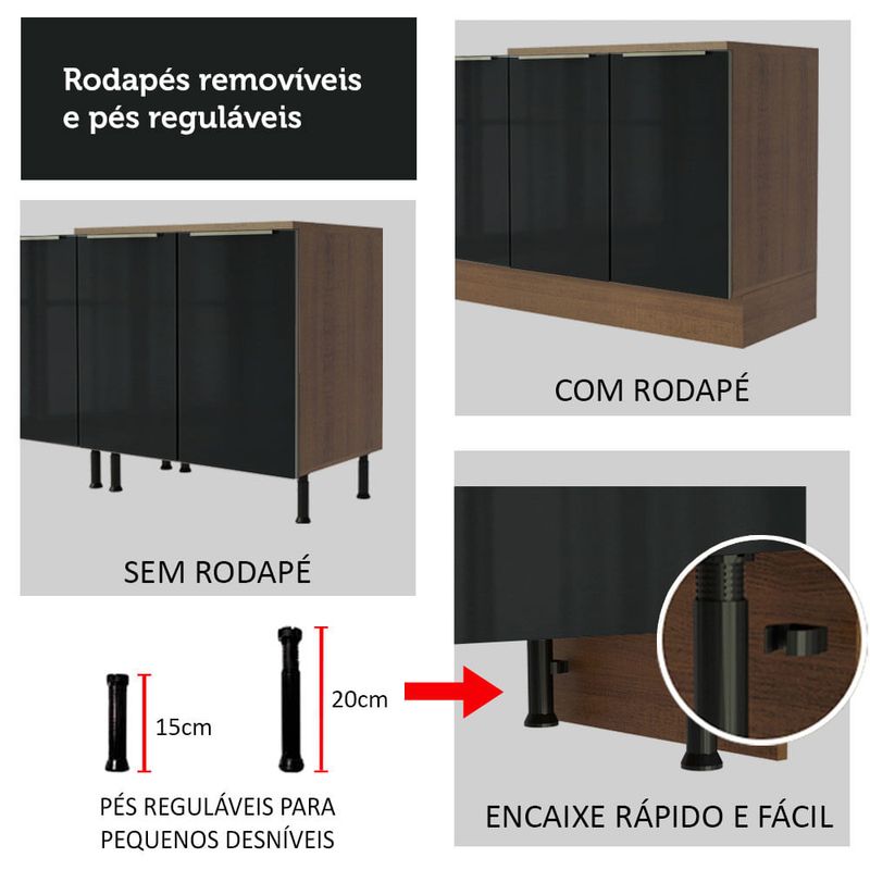 As gavetas possuem corrediças telescópicas e todas as portas contém amortecedor para o fechamento suave. Além disso, os puxadores são em alumínio, mais resistentes ao uso diário.
