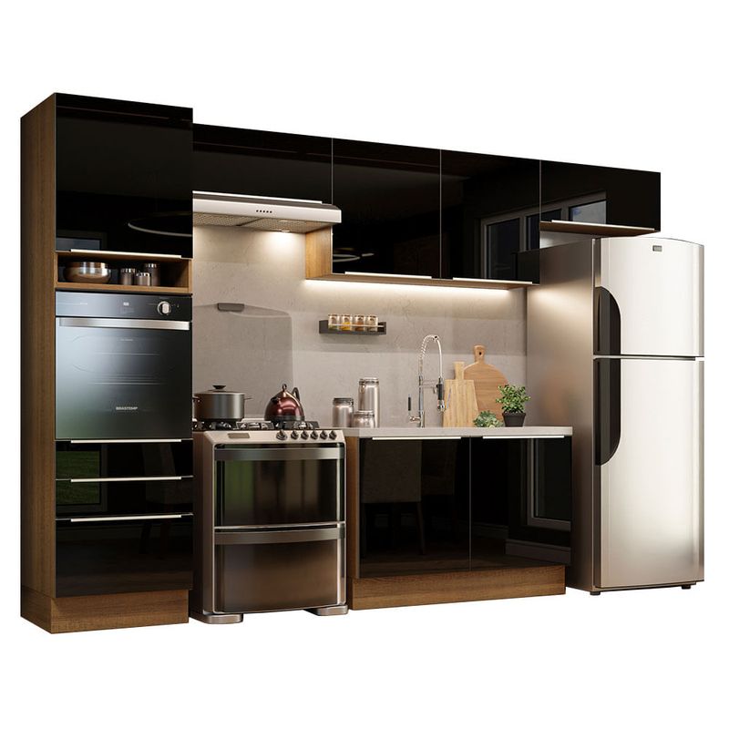 A linha de cozinhas Lux da Madesa é uma das mais sofisticadas e modernas do mercado. O principal destaque são as portas e gavetas, que recebem um vidro preto aplicado, um diferencial que traz muita elegância ao seu ambiente.