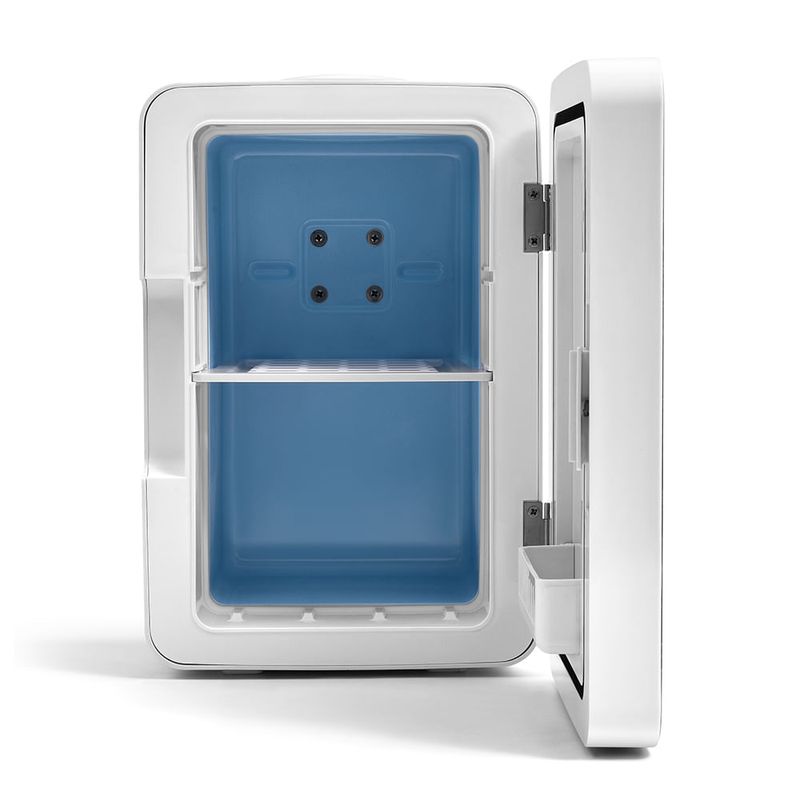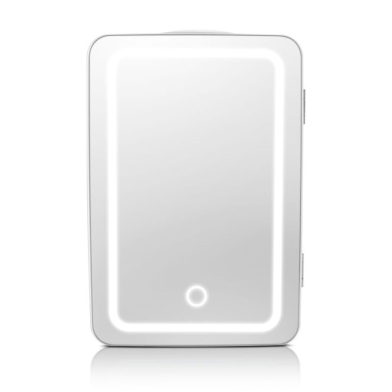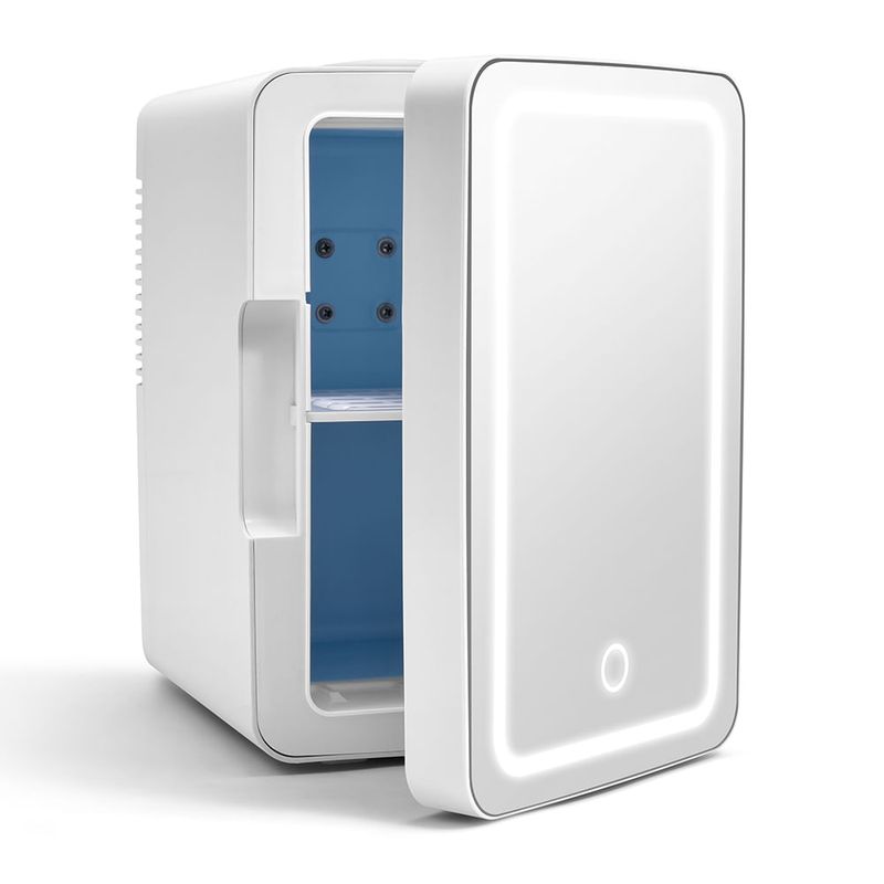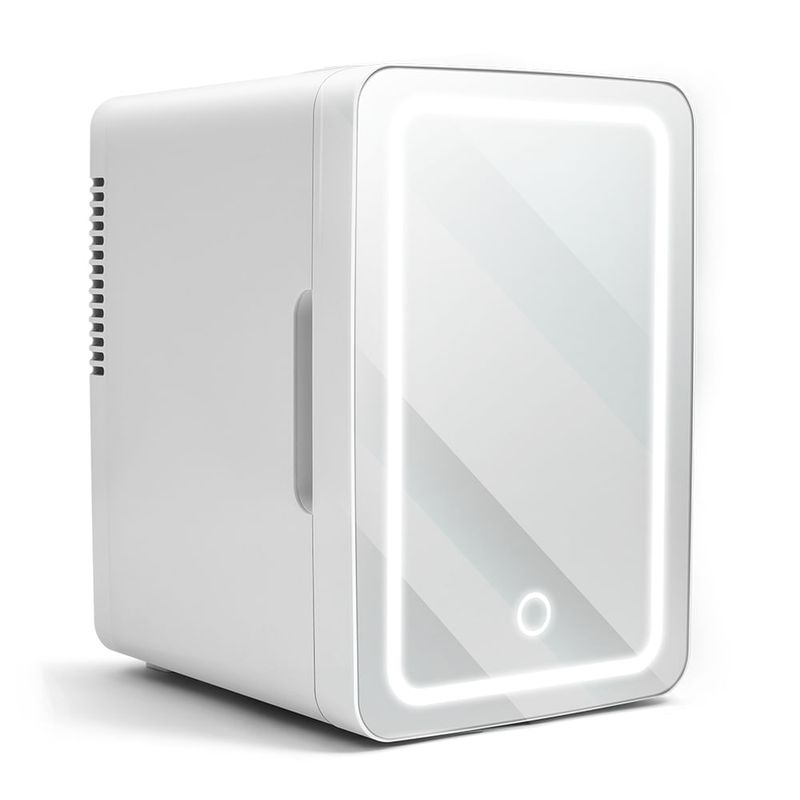 A Mini Geladeira Espelhada com LED é compacta e portátil! Ideal para bancadas, banheiros e até mesmo viagens. Possui um design moderno com porta espelhada e iluminação LED. Com capacidade de 6 Litros, grade na porta e prateleiras internas com regulagem de altura, é possível armazenar alimentos, bebidas ou até mesmo cosméticos.