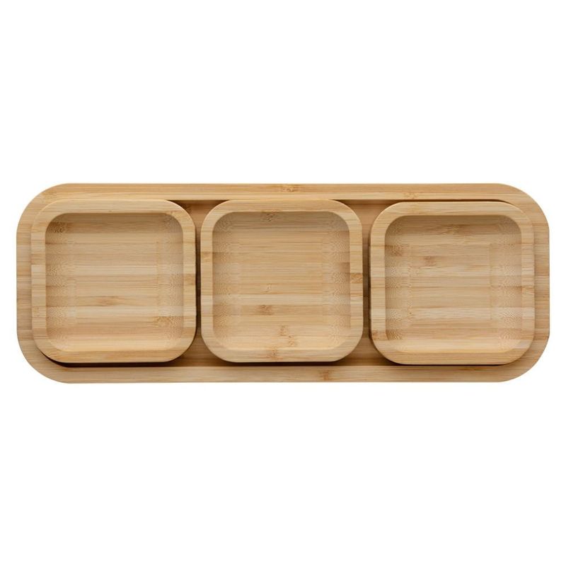 Bela pestisqueira de bambu composta por uma bandeja pestiqueira e tres petisqueirinhas