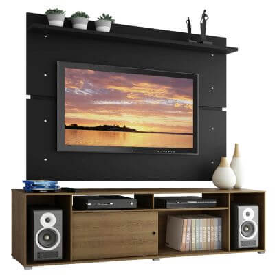 O painel comporta TV de até 65 polegadas e conta com abertura para passar os fios. Contempla também uma prateleira na parte superior, perfeita para objetos decorativos. Por ser separado do rack, pode ser fixado na altura desejada.