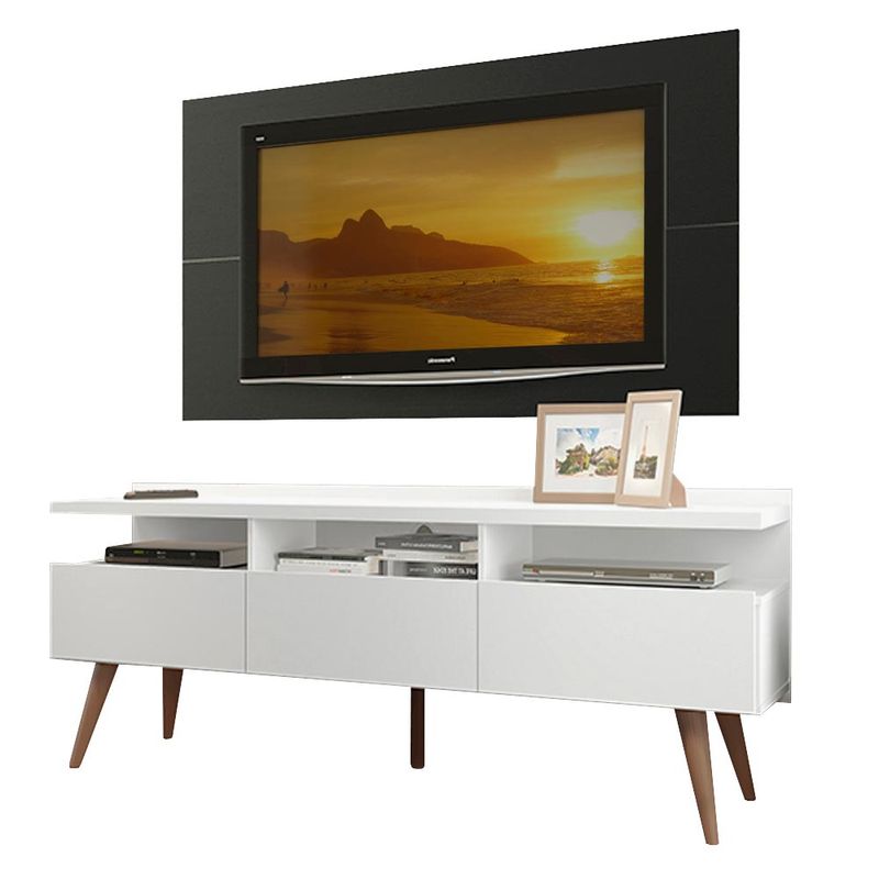 O Rack Londres possui design moderno, e conta com três portas e nichos abertos para os aparelhos eletrônicos, além de espaço para passar os fios.